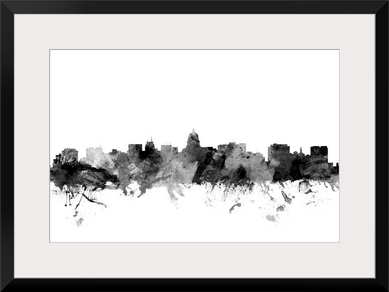 <p>Contemporary artwork of the Madison city skyline in black watercolor paint splashes.</p>