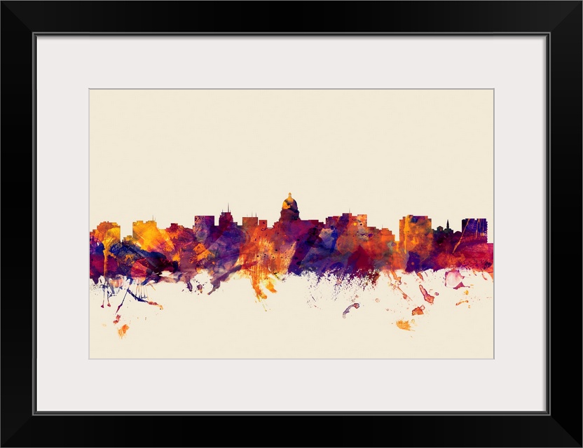 <p>Contemporary artwork of the Madison city skyline in watercolor paint splashes.</p>
