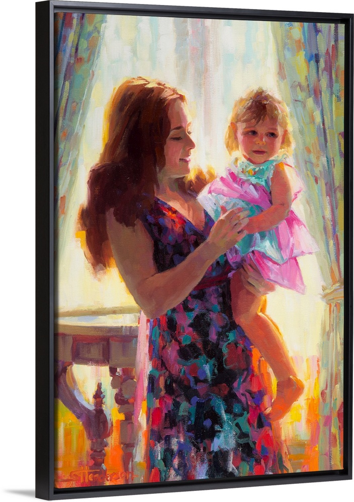 <p>Traditional representational painting of a mother holding her toddler daughter, inside a nostalgic old home sitting room</p>