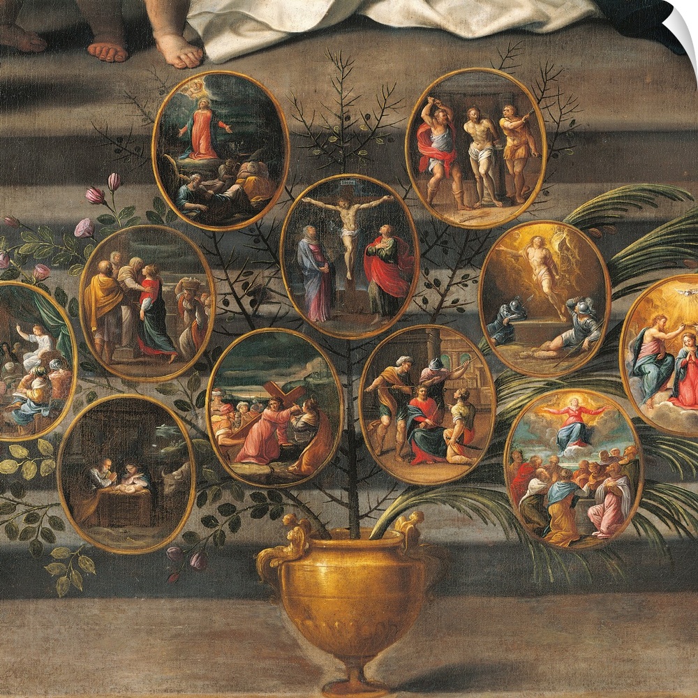 <p>Appearance of the Virgin to St Dominic (Madonna of the Rosary), by Guido Reni, 1597 - 1598, 16th Century, oil on canvas, cm 260 x 220 - Italy, Emilia Romagna, Bologna, Sanctuary of San Luca. Detail. Medallions with the Mysteries of the Rosary, episodes fr</p>