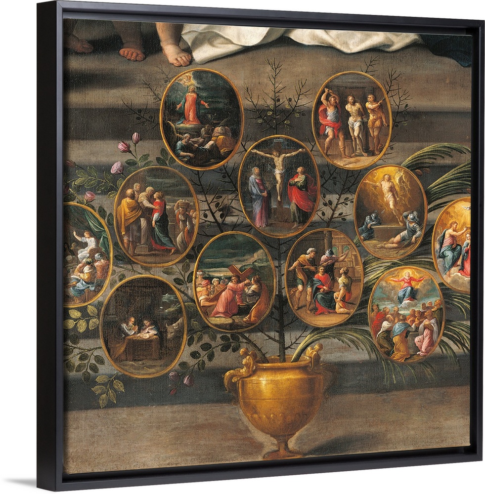 <p>Appearance of the Virgin to St Dominic (Madonna of the Rosary), by Guido Reni, 1597 - 1598, 16th Century, oil on canvas, cm 260 x 220 - Italy, Emilia Romagna, Bologna, Sanctuary of San Luca. Detail. Medallions with the Mysteries of the Rosary, episodes fr</p>
