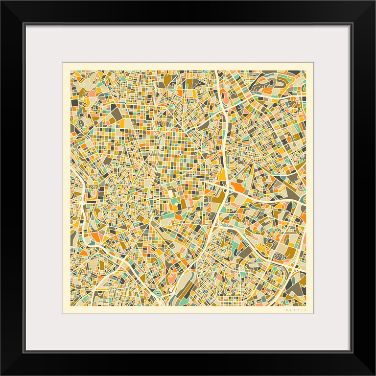<p>Colorfully illustrated aerial street map of Madrid, Spain on a square background.</p>