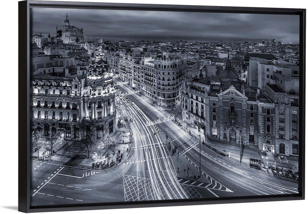<p>A photograph of Madrid with light trails covering the roads, Spain.</p>
