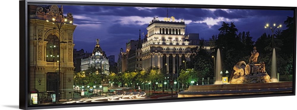 <p>Panoramic photo of old Spanish buildings around a traffic circle with long exposed car lights going around it with a statue in the center.</p>