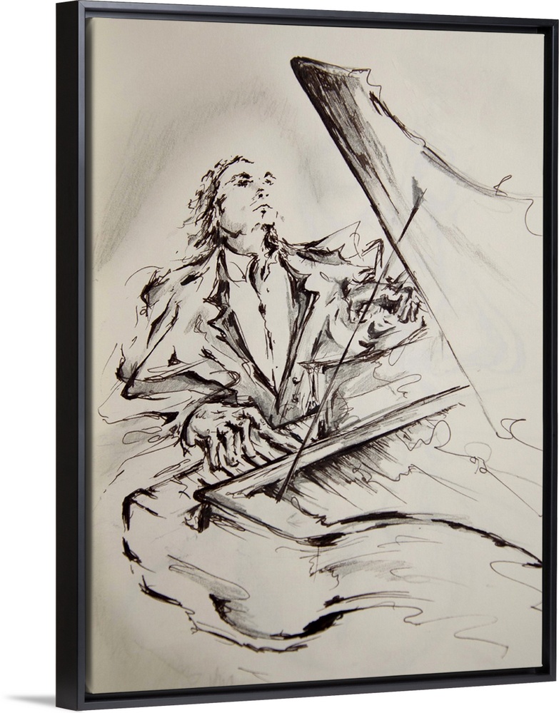 <p>Ink painting of a man in a tuxedo playing a grand piano.</p>