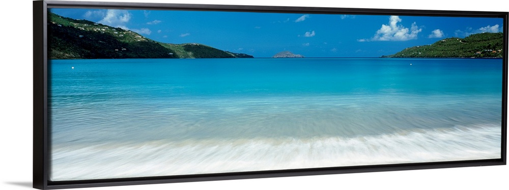 <p>Panoramic photograph of clear water in a calm sea washing up a tropical beach.</p>