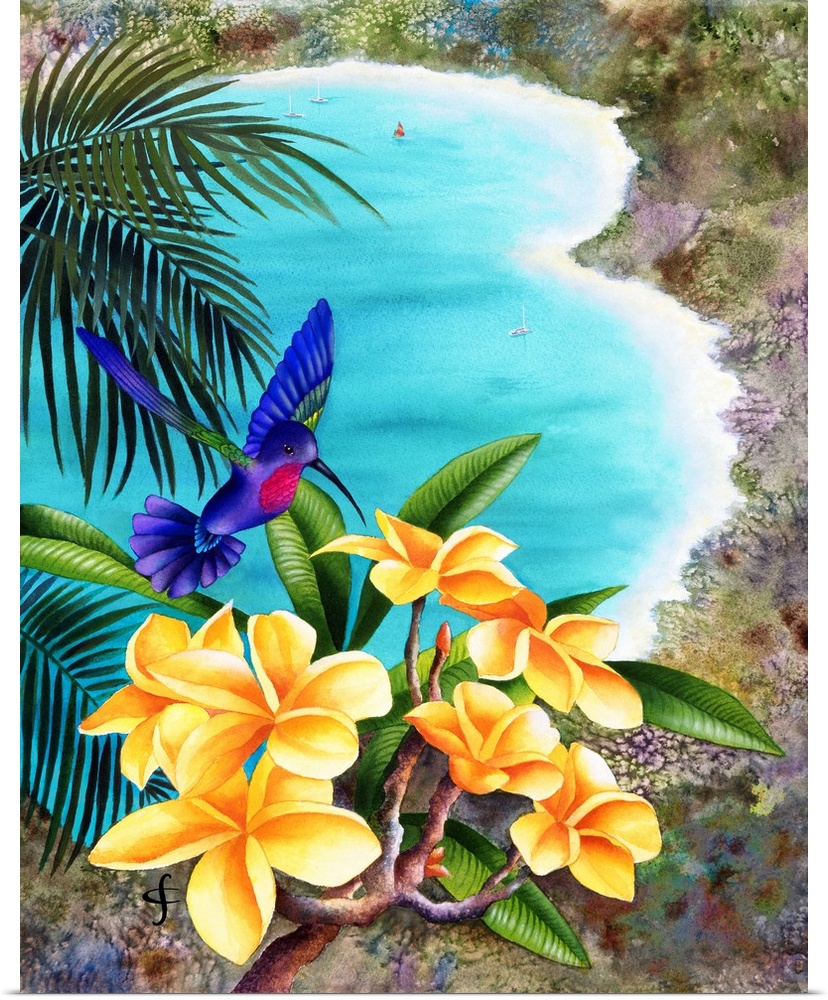 <p>Tropical themed artwork using bright vivid colors to depict the flowers and animals of the environment.</p>