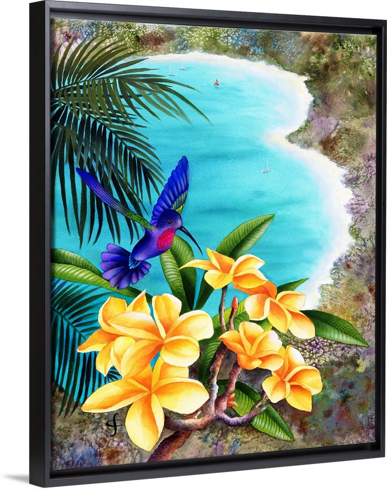 <p>Tropical themed artwork using bright vivid colors to depict the flowers and animals of the environment.</p>