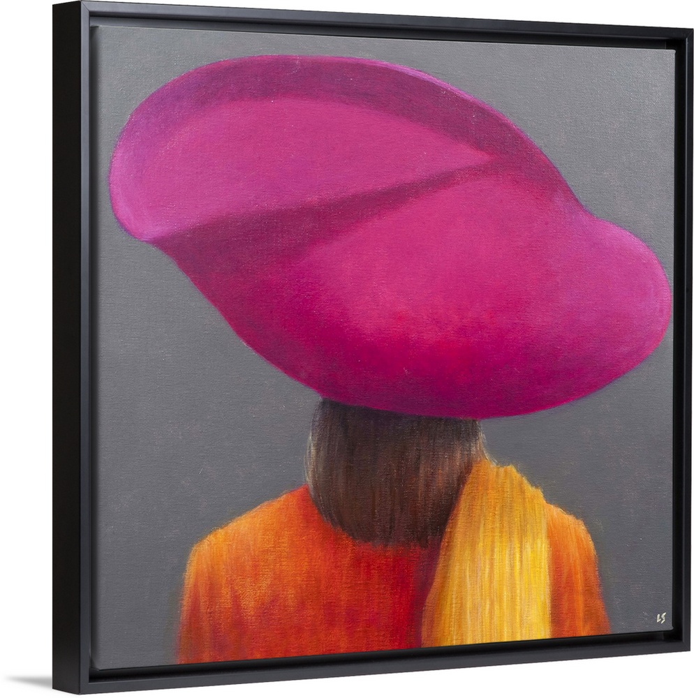 <p>Contemporary painting of a rear view of a women wearing a large pink hat.</p>