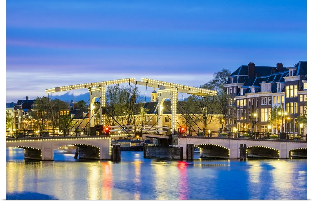 <p>Netherlands, North Holland, Amsterdam. Magere Brug, Skinny Bridge, on the Amstel River at night.</p>