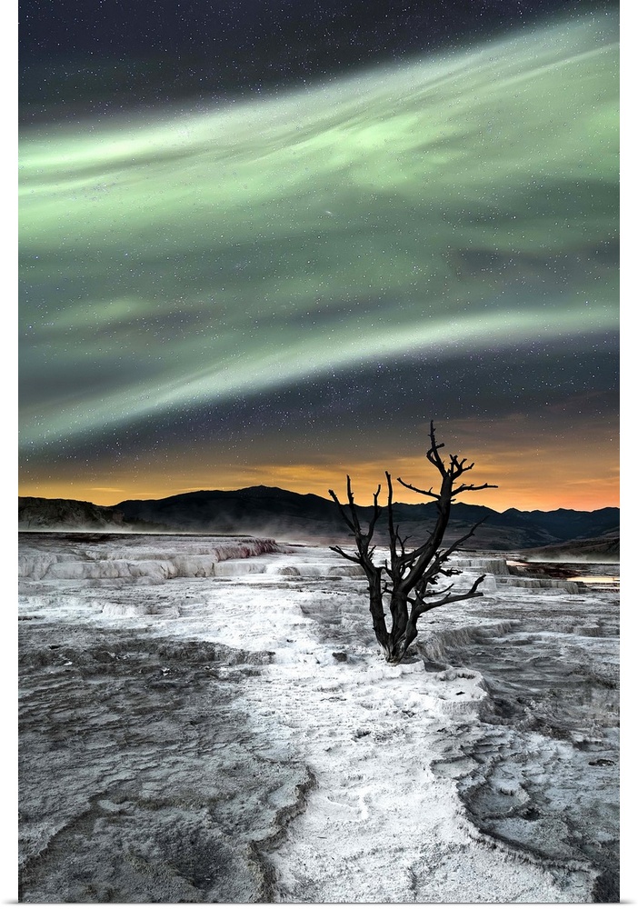 <p>A barren tree in a rocky landscape under a glowing green aurora borealis.</p>