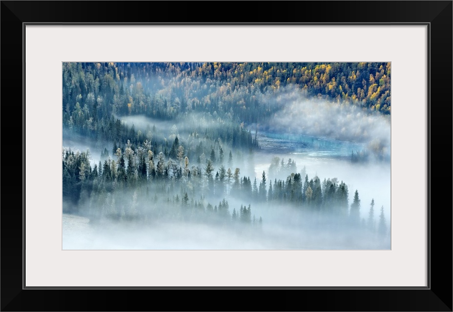 <p>Dense fog settles over a forest in the fall in Xinjiang, China.</p>