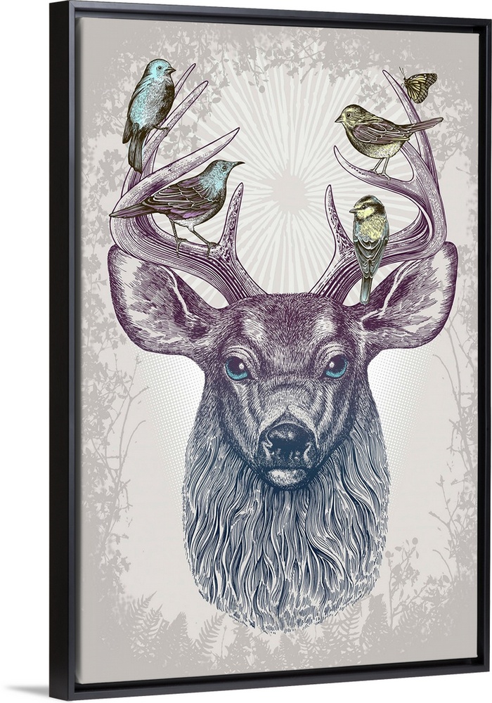 <p>A digital illustration of a buck with birds sitting on his antlers.</p>