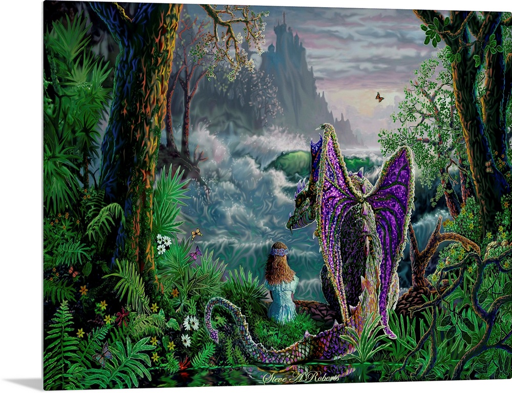 <p>Girl sitting next to a dragon looking over the prehistoric landscape</p>