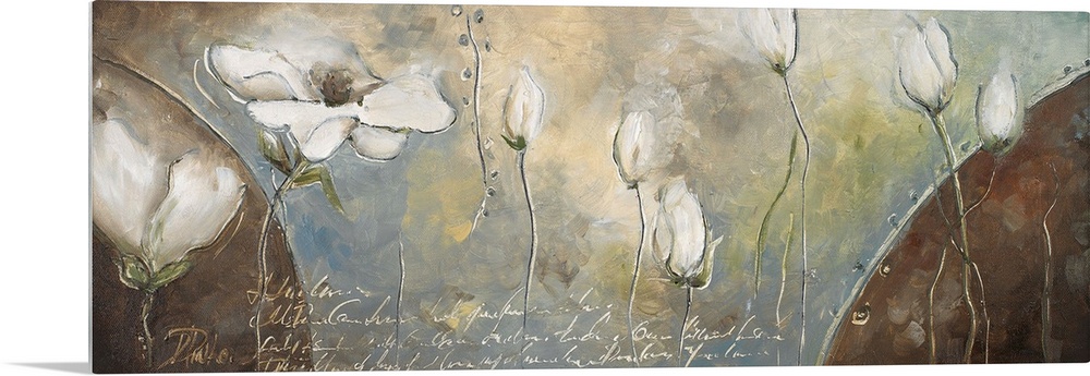 <p>Huge, horizontal home art docor of a line of white flowers in various sizes, floating horizontally across the image on a background of earth tones with short brushstrokes. Script text at the bottom of the image, just below the flower stems.</p>