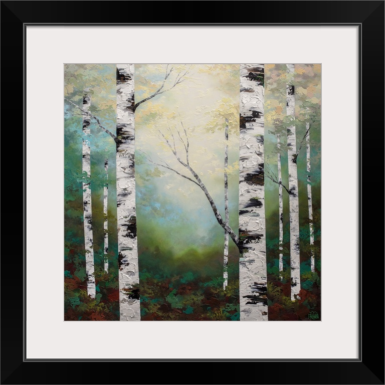 <p>Ethereal forest landscape painting of birch trees and aspen trees in sunlight Giclee art print on canvas by contemporary abstract landscape artist Melissa McKinnon painted with palette knife and impasto texture.</p>