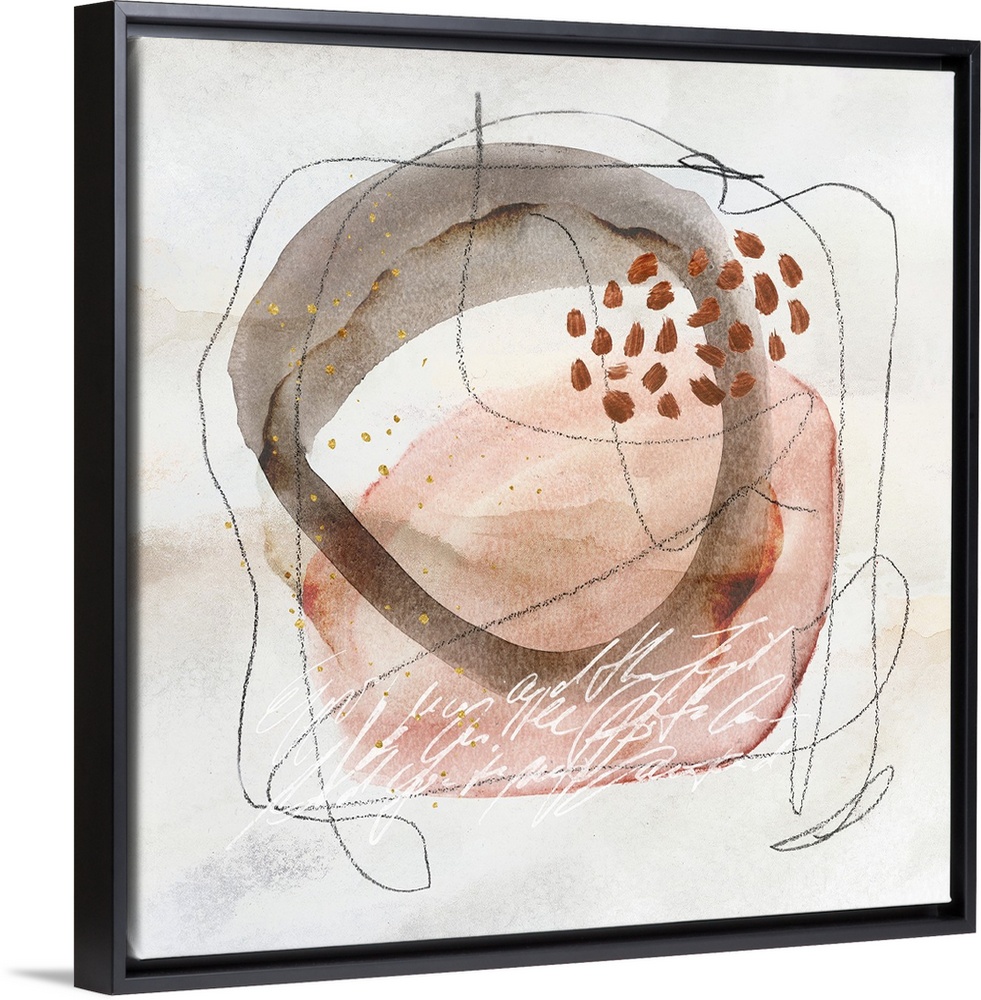 <p>Mixed media watercolor abstract art with handwriting, shapes, and lines in soft pastel neutral colors with some gold.</p>