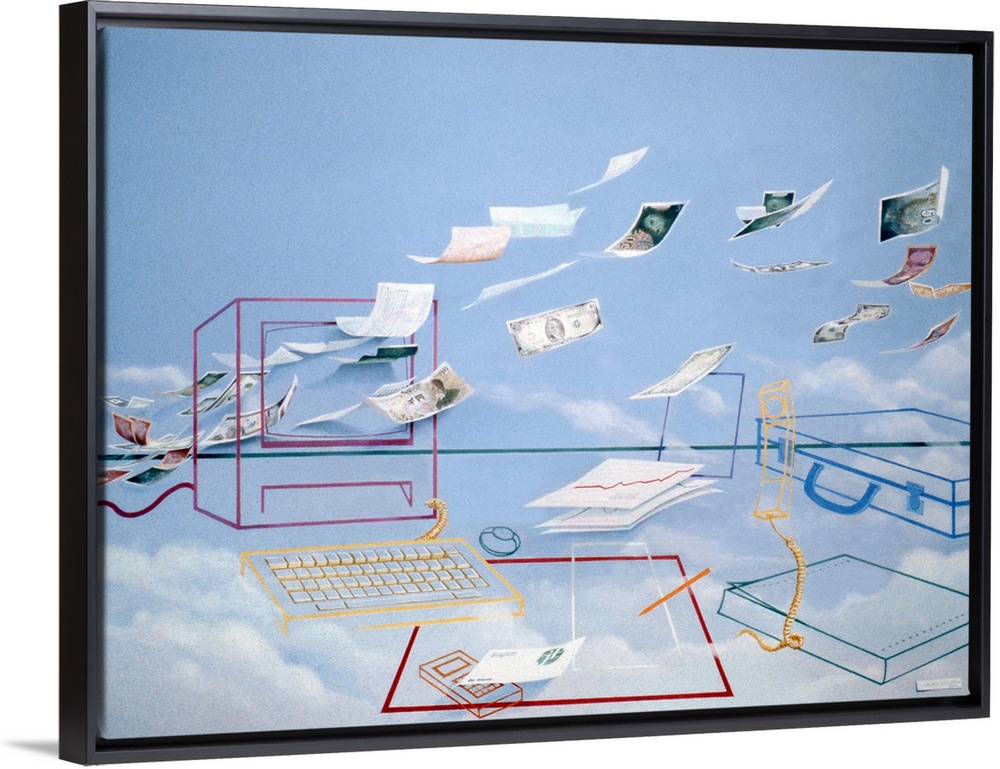 <p>Abstract contemporary painting of images and papers flying through wire structures of electronics.</p>
