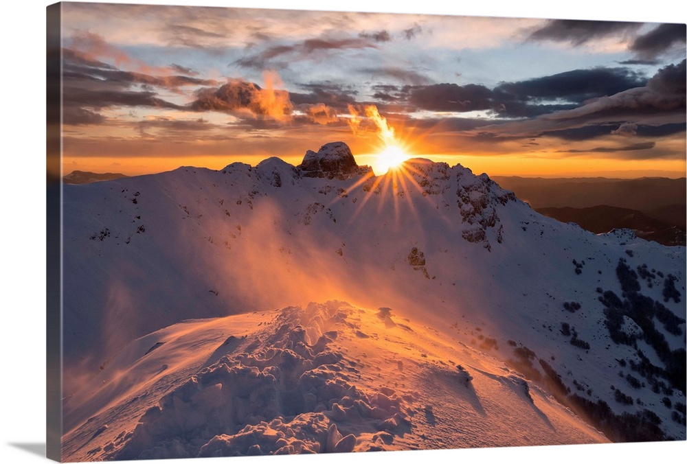 <p>Magic winter sunset over Gendearme mountain, Cerreto Laghi, municipality of Ventasso, Reggio Emilia Province, Emilia Romagna District, northern Italy.</p>