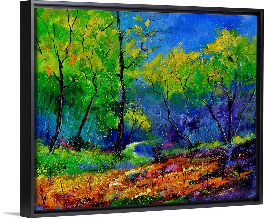 <p>Vibrant painting of a colorful path through a forest of green leaved trees and a bright blue sky.</p>