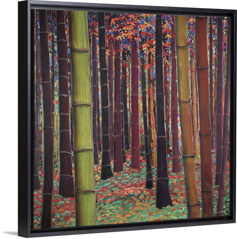 <p>A square contemporary painting of a forest of bamboo trees in different shades of brown with colorful leaves and grass.</p>