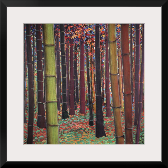 <p>A square contemporary painting of a forest of bamboo trees in different shades of brown with colorful leaves and grass.</p>