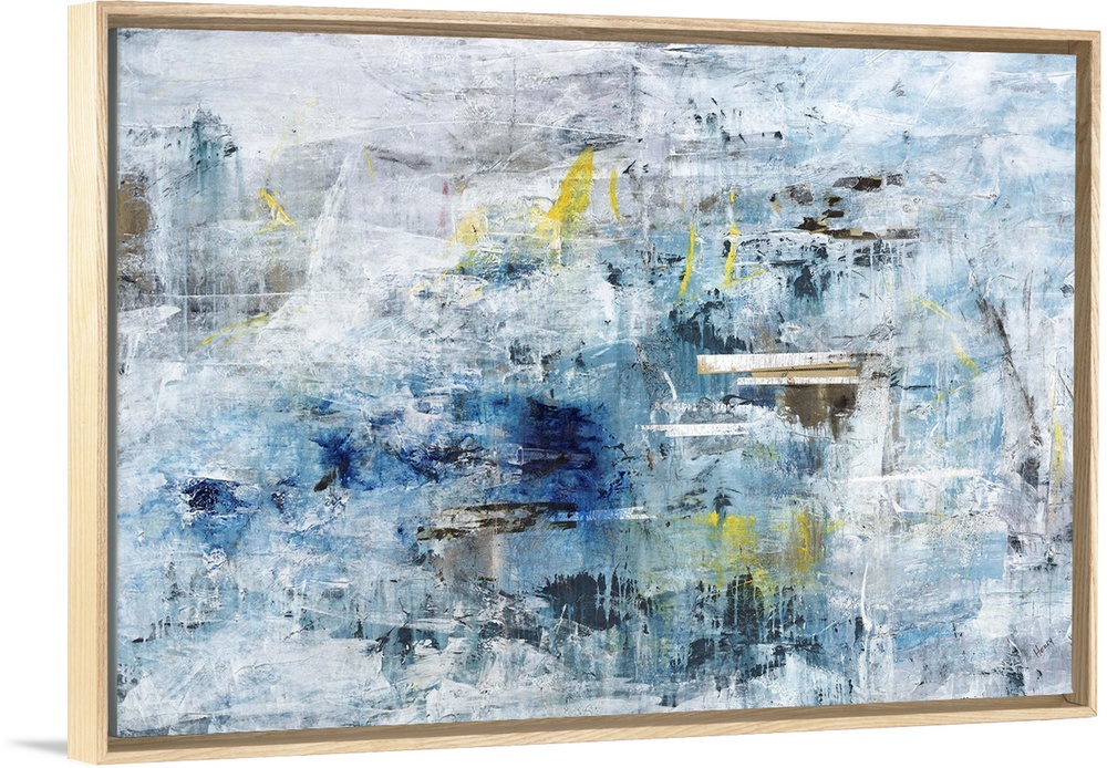 <p>A textured abstract painting in shades of blue and gray with elements of yellow throughout.</p>