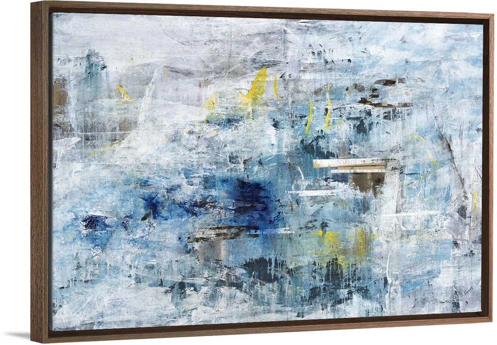 <p>A textured abstract painting in shades of blue and gray with elements of yellow throughout.</p>