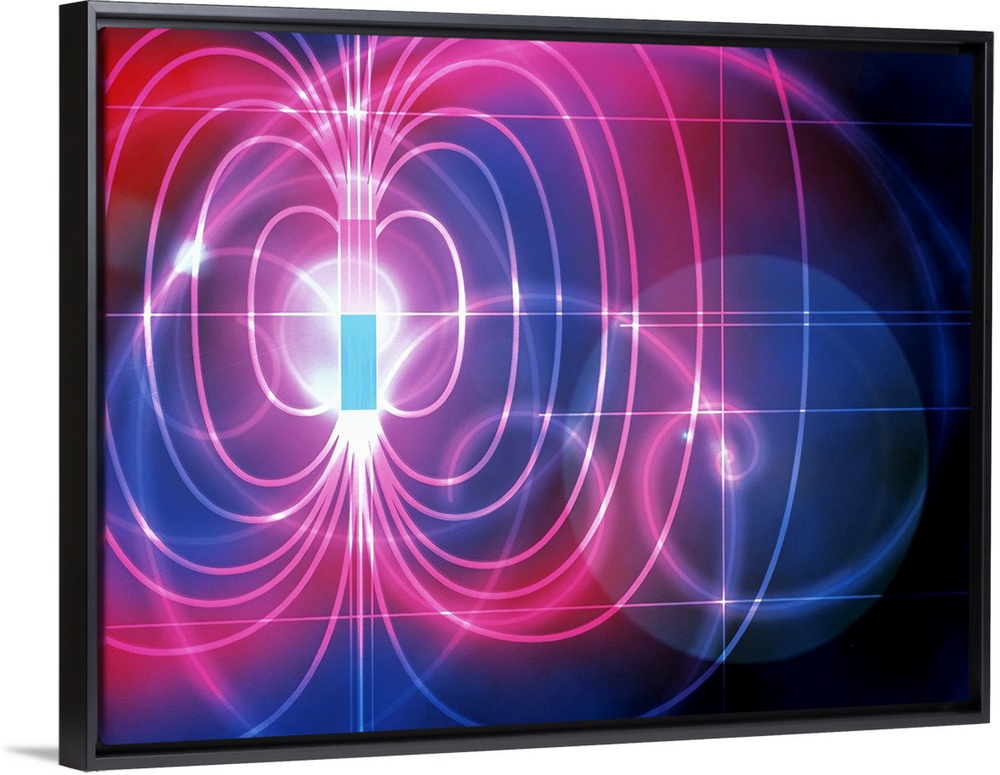<p>Magnetic field. Computer artwork of the magnetic field around a magnet. The field is the three- dimensional region around a magnet where magnetic forces can be experienced. It is represented here as a series of lines which run in closed loops between the poles of the magnet (pink and blue). A magnetic field always runs from the north pole to the south pole. The field lines show the path that a magnetic north pole would follow if placed within the field. The magnetic forces which cause the pole to move are produced by the motion of charged particles within the magnet. These forces influence other magnetic materials in the field without physically contacting them.</p>