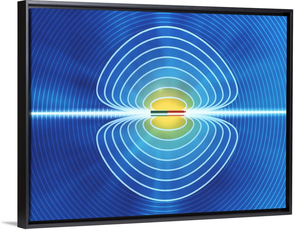 <p>Magnetic field. Computer artwork of the magnetic field around a magnet. The field is the three- dimensional region around a magnet where magnetic forces can be experienced. It is represented here as a series of lines which run in closed loops between the poles of the magnet (red and green). A magnetic field always runs from the north pole to the south pole. The field lines show the path that a magnetic north pole would follow if placed within the field. The magnetic forces which cause the pole to move are produced by the motion of charged particles within the magnet. The strength of the magnetic field decreases as the distance from the magnet increases.</p>