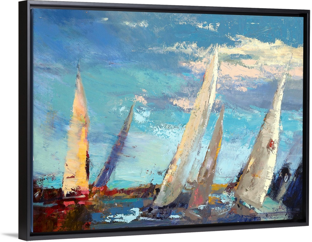 <p>A contemporary coastal themed painting of sailboats sailing the open sea.</p>