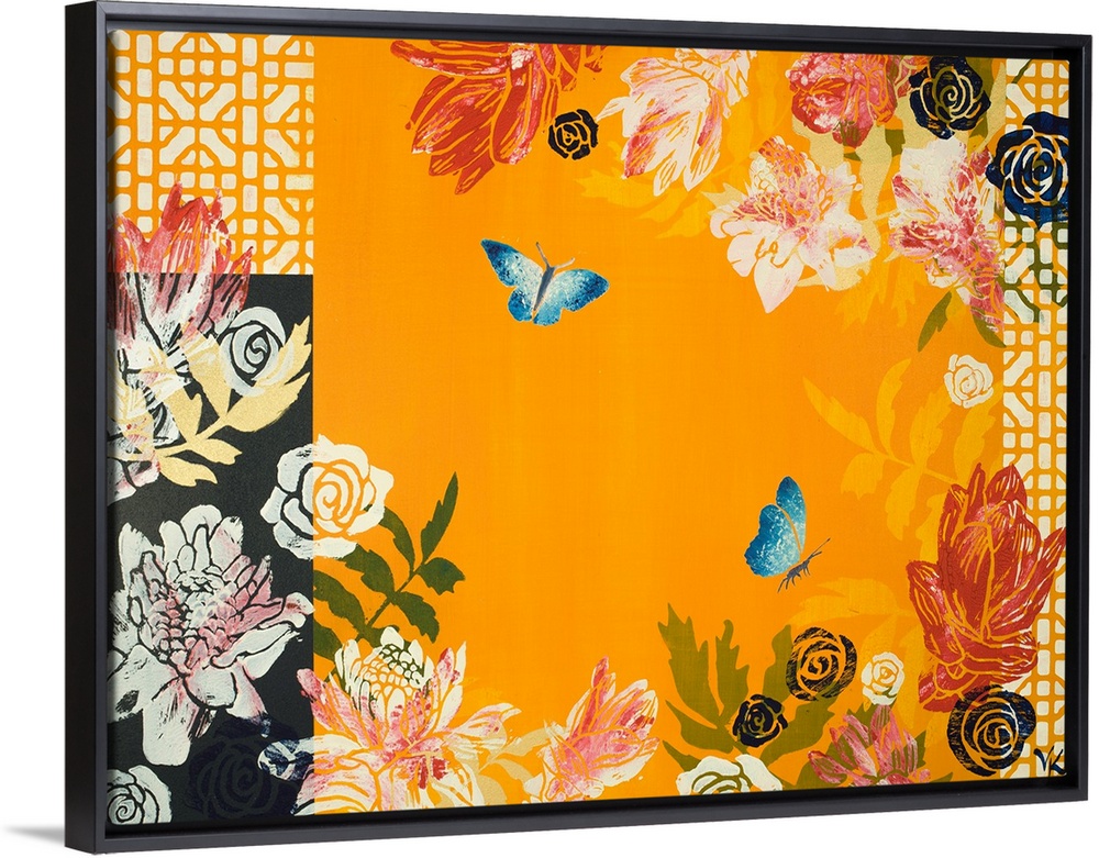 <p>Painting of two butterflies in garden of ginger flowers with yellow background and navy and yellow screens.</p>