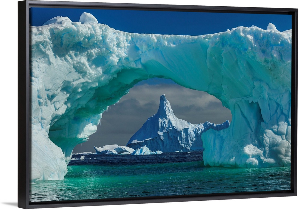 <p>The peak of an Antarctic mountain seen through the natural arch of a turquoise glacier.</p>