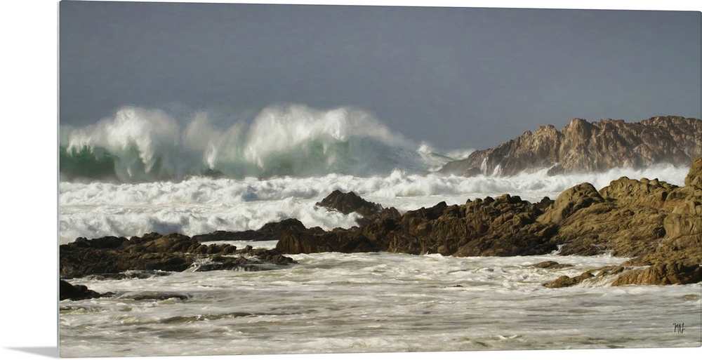 <p>A stunning wave crashes next to Bird Rock, a popular site along the 17 Mile Drive in Pebble Beach. On this day, the heavy surf is full of remarkable shapes and colors, from the teals inside the wave to the subtle browns and greens caused by prior waves stirring up sand and seagrass on the ocean floor. The granite rock formations draw your eyes to and fro, as you explore the moment in all its richness and depth.</p>