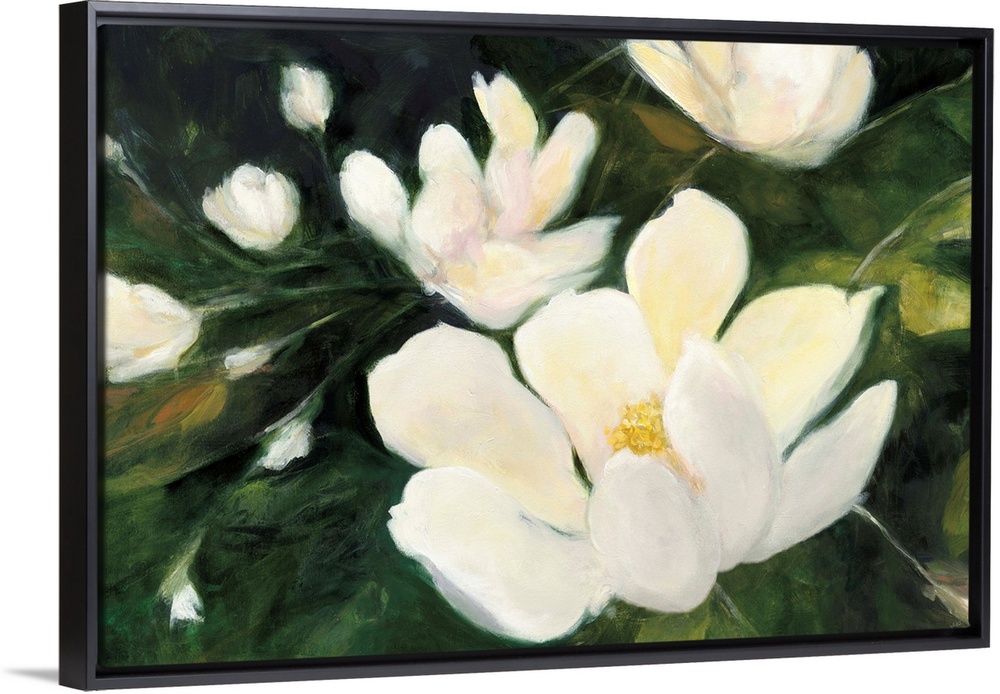 <p>Abstract painting of white magnolia flowers and buds on a dark green background.</p>