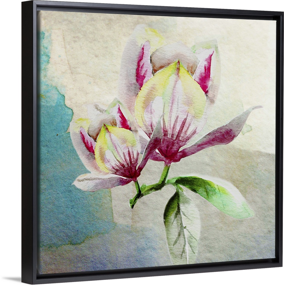 <p>Square watercolor painting of a two magnolia flowers in shades of pink, yellow, white, and green on an abstract background.</p>