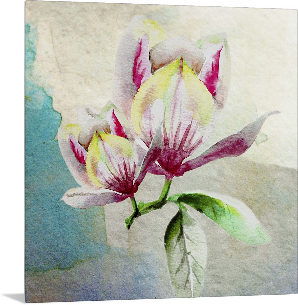 <p>Square watercolor painting of a two magnolia flowers in shades of pink, yellow, white, and green on an abstract background.</p>
