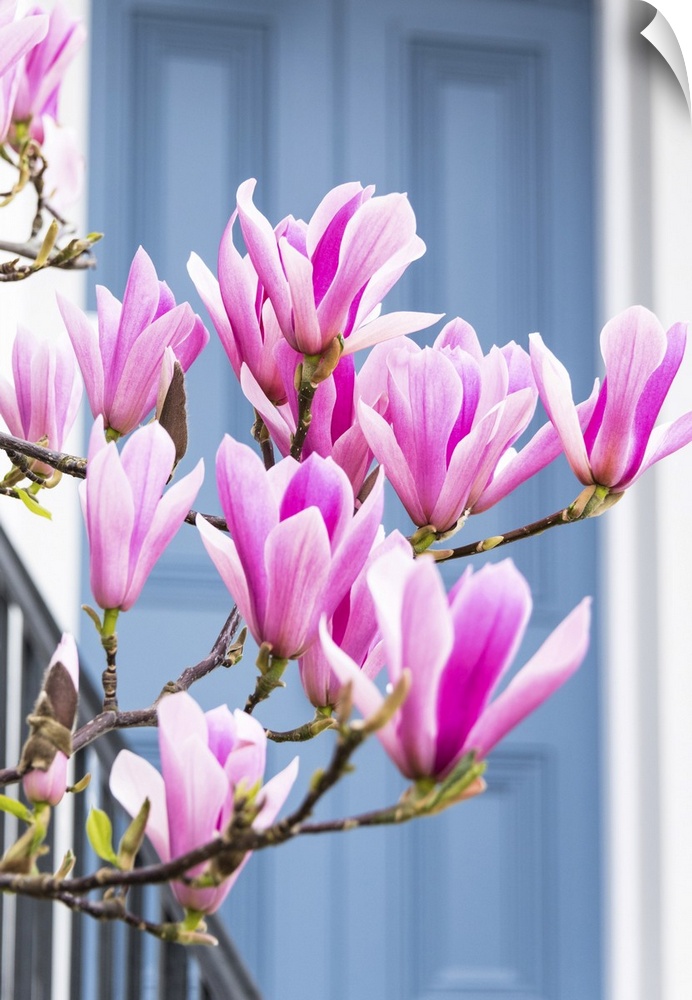 <p>Magnolia tree in full bloom outside a house with a grey door in Kensington, London, England</p>