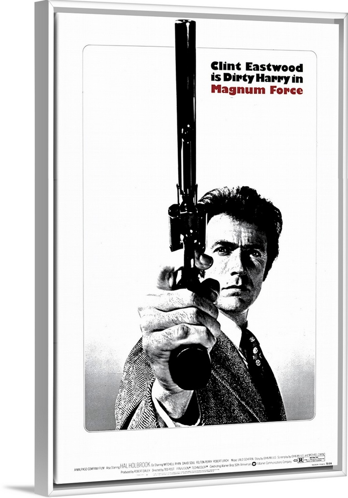 <p>Poster for the movie "Magnum Force" showing Clint Eastwood and the gun he is holding straight up into the air very largely in the foreground.</p>