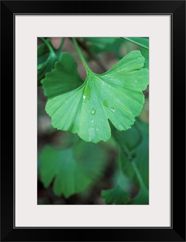 <p>Maidenhair tree leaf (Ginkgo biloba) with a raindrop on its surface. An extract from the leaves of this unique species of tree is commonly used in herbal medicine to improve circulation to the brain and extremities.</p>