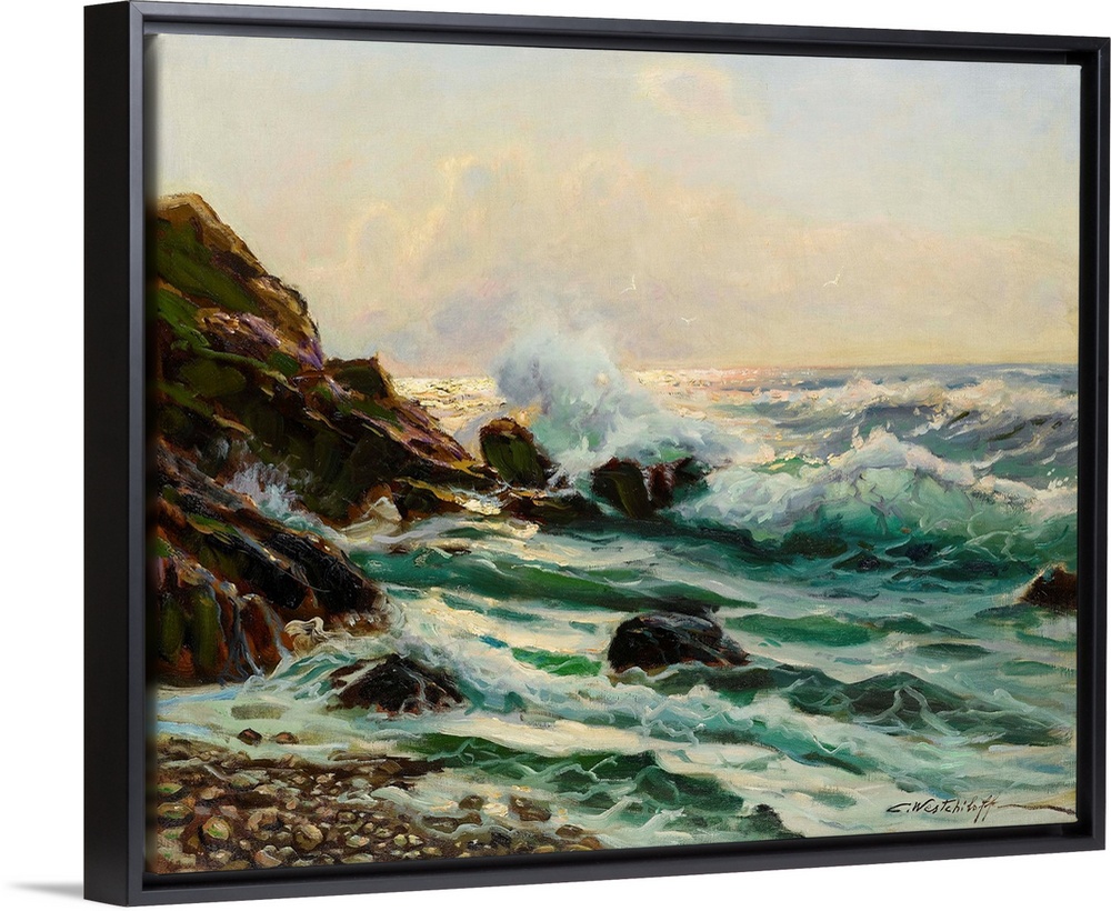 <p>Classic painting of waves crashing against the rocky coast in golden light.</p>