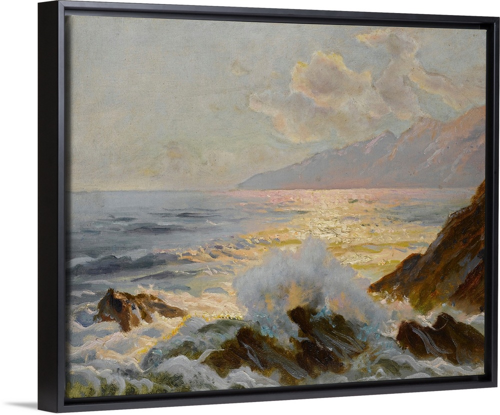 <p>Classic painting of waves crashing against the rocky coast in golden light.</p>