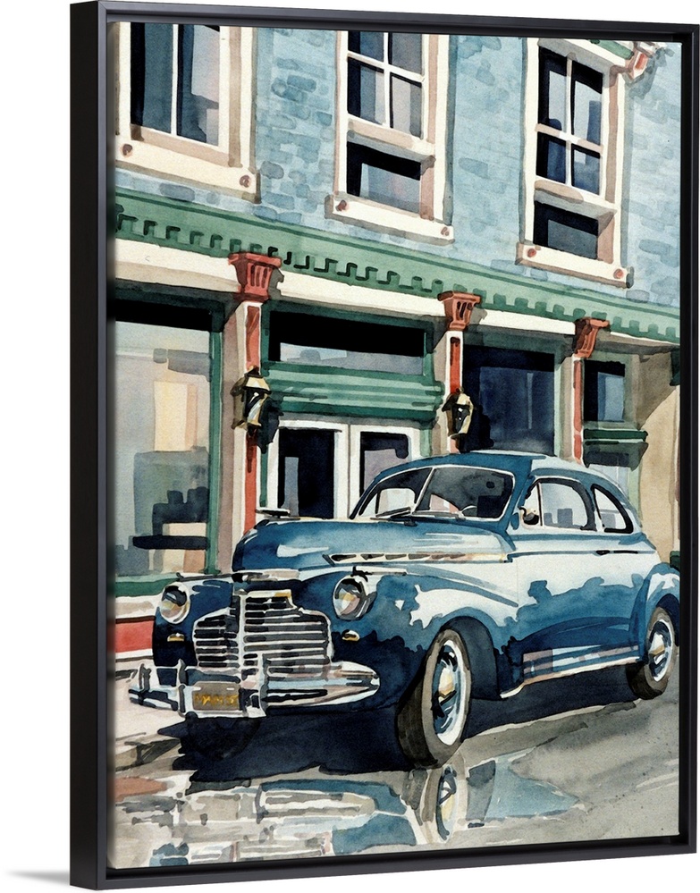 <p>Watercolor painting of a 1941 Chevrolet pulled up to the curb.</p>