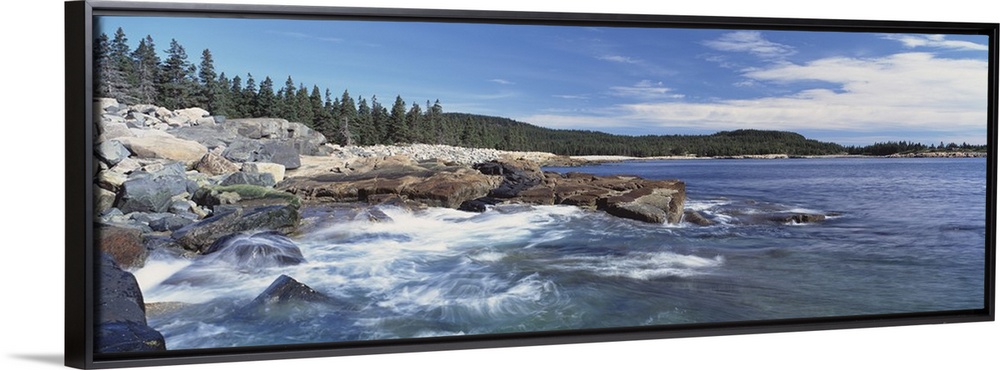 <p>Panoramic photograph of rocky shoreline with surf. There are trees in the distance under a cloudy sky.</p>
