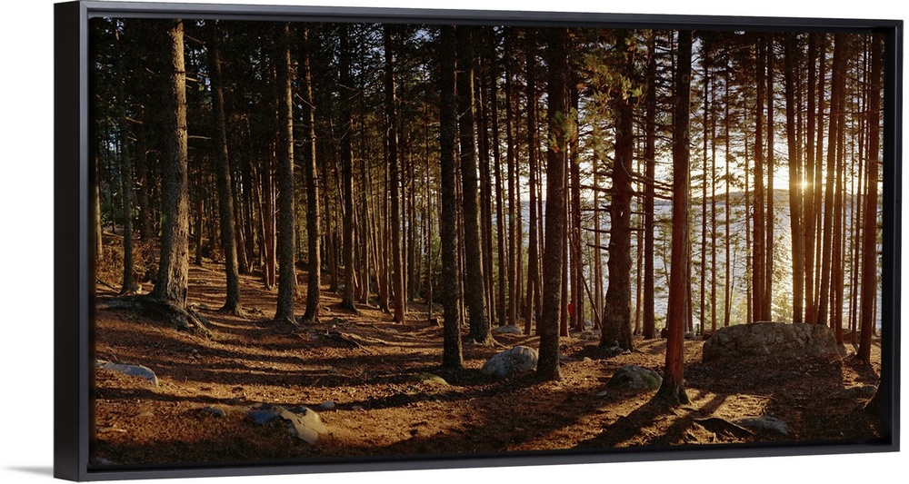 <p>Panoramic photograph taken inside a thick forest with the sunset peeking through the grouping of trees.</p>