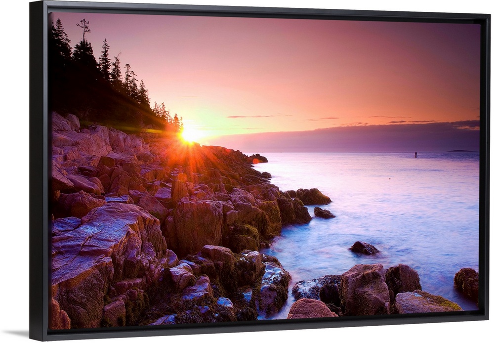 <p>United States, USA, Maine, Mount Desert Island, Atlantic ocean, New England, Acadia National Park, Travel Destination, Cliffs near Bass Harbor at sunrise</p>