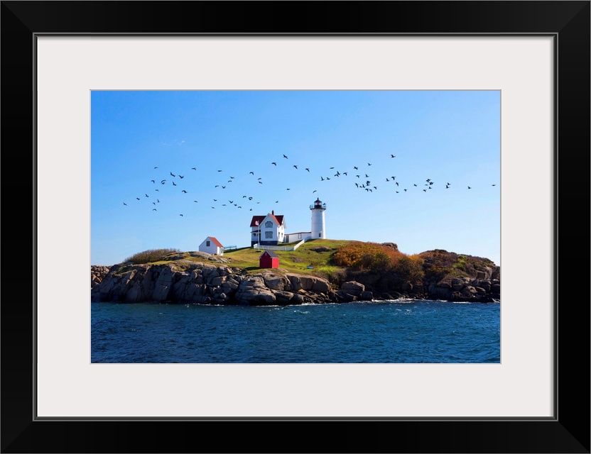 <p>USA, Maine, Cape Neddick, New England, Atlantic, Nubble Lighthouse on the Savage Rock with a flock of birds flying by.</p>