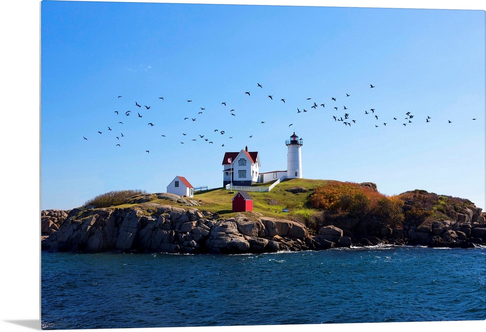 <p>USA, Maine, Cape Neddick, New England, Atlantic, Nubble Lighthouse on the Savage Rock with a flock of birds flying by.</p>