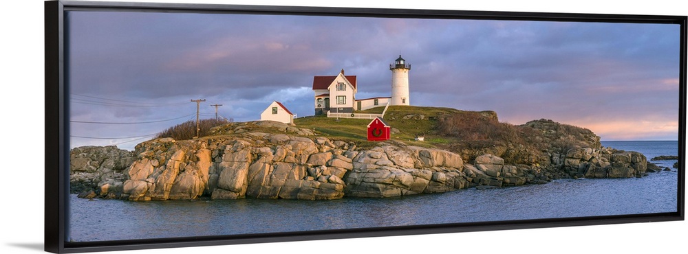 <p>USA, Maine, York Beach, Nubble Light Lighthouse with Christmas decorations, dusk.</p>