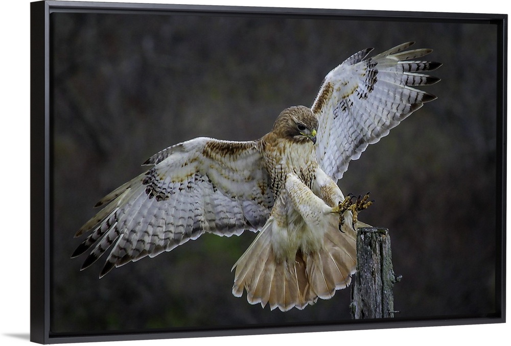 <p>A hawk showing off its beautiful wings as it lands on a branch.</p>